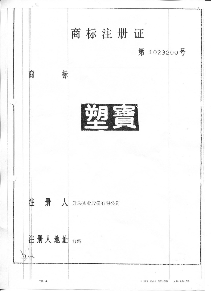 下列各式商標(biāo)為本公司于大陸取得之商標(biāo)注冊(cè),僅授權(quán)太倉(cāng)市塑寶環(huán)保機(jī)械及增城市升展機(jī)械公司使用,其余非經(jīng)我司書(shū)面許可而濫用者,本公司將采取法律行動(dòng),追索侵權(quán)之損害賠償。